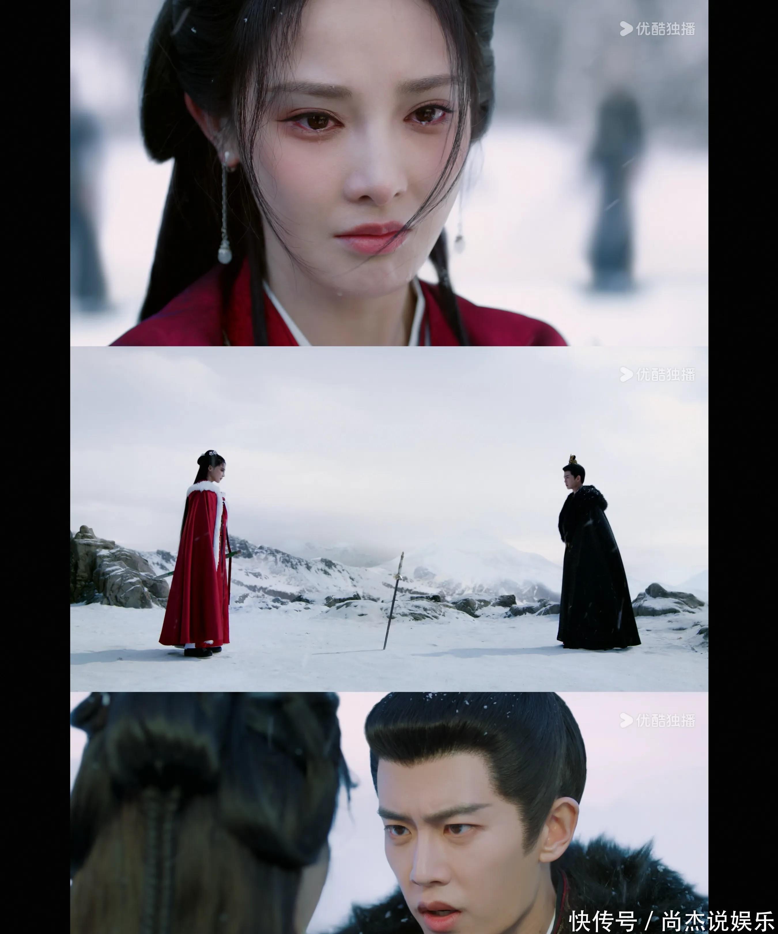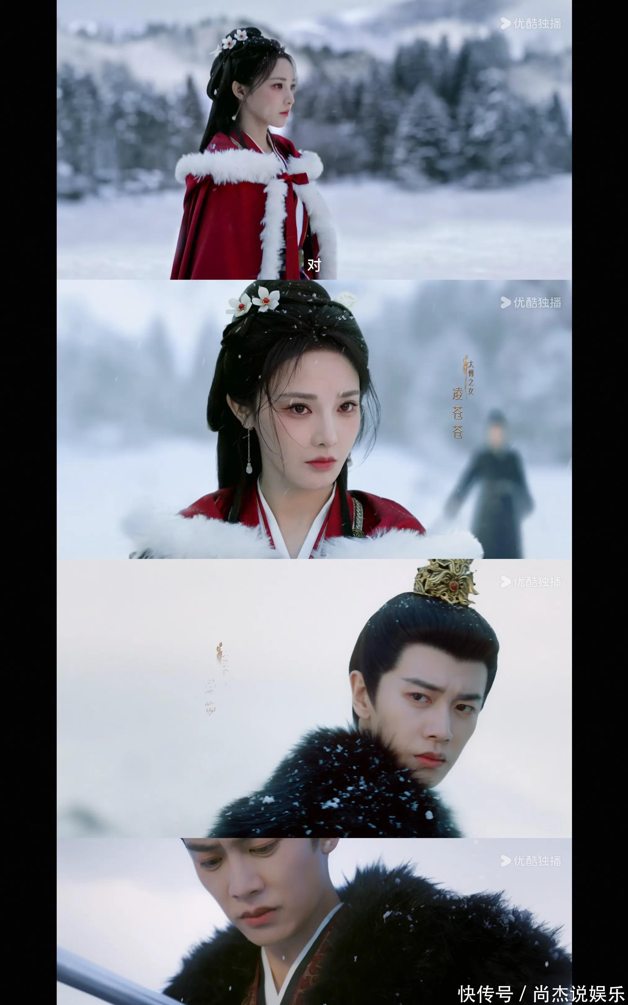 白雪茫茫的郊外中,任嘉伦上演的萧焕一东说念主颓败风雪中,彭小苒上演的凌苍苍一袭红色披风来势汹汹走向他。