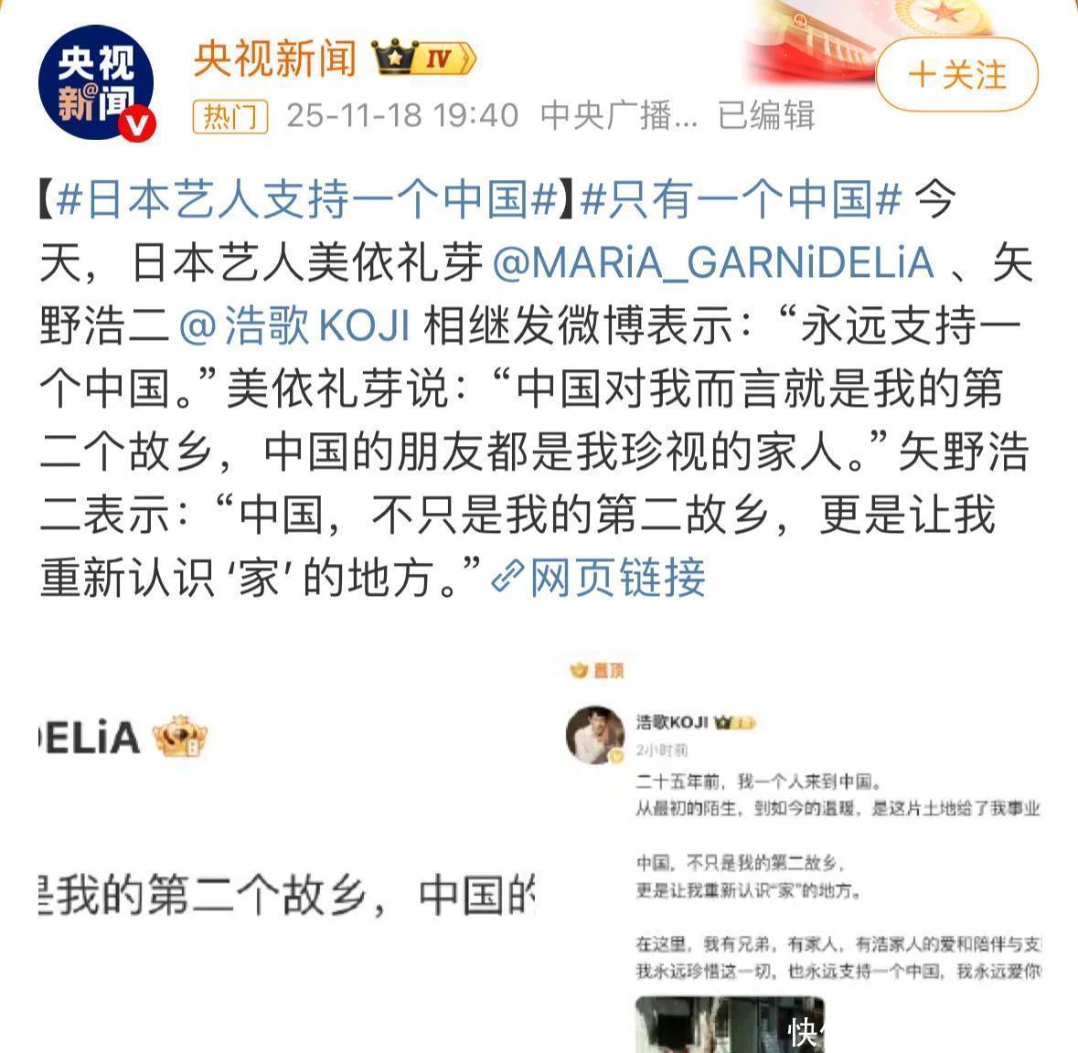 今天,央视又点名了,日本艺东谈主矢野浩二和好意思依礼芽,在“唯唯一个中国”这个态度磨练中,相似拿到了满分。