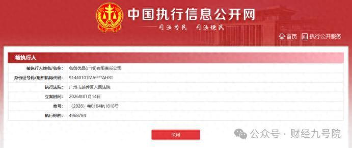 中国推广信息公开网自满,1月14日,其境内中枢实体名创优品(广州)有限包袱公司被广州市越秀区东谈主民法院列为被推广东谈主,推广金额达496.88万元。
