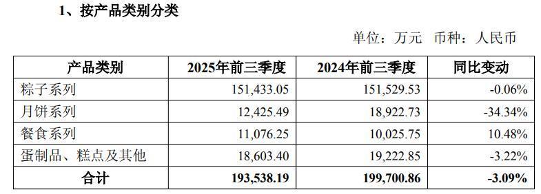 公告潜入,按产物类别看,公司粽子销售微跌0.06%,蛋成品、糕点格外他销售跌3.22%,月饼系列销售大减34.34%,但餐食系列销售增多10.48%。