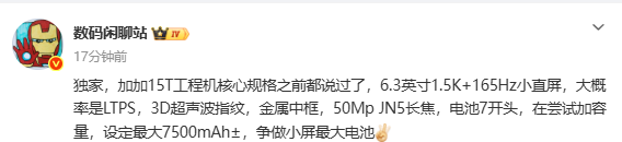 【CNMO科技音信】1月7日开云体育(中国)官方网站,数码博主@数码谈天站 爆料称,一加15T将配备6.3英寸小直屏,预测遴荐LTPS材料,撑握165Hz刷新率和3D超声波指纹,机身遴荐金属中框,后置5000万像素JN5长焦镜头,电板设定最大为7500mAh傍边,争取作念最大电板的小屏手机。